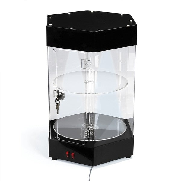 This 360 degree rotating acrylic display case features two LED lights and a cam-lock with keys. Power cord is included.