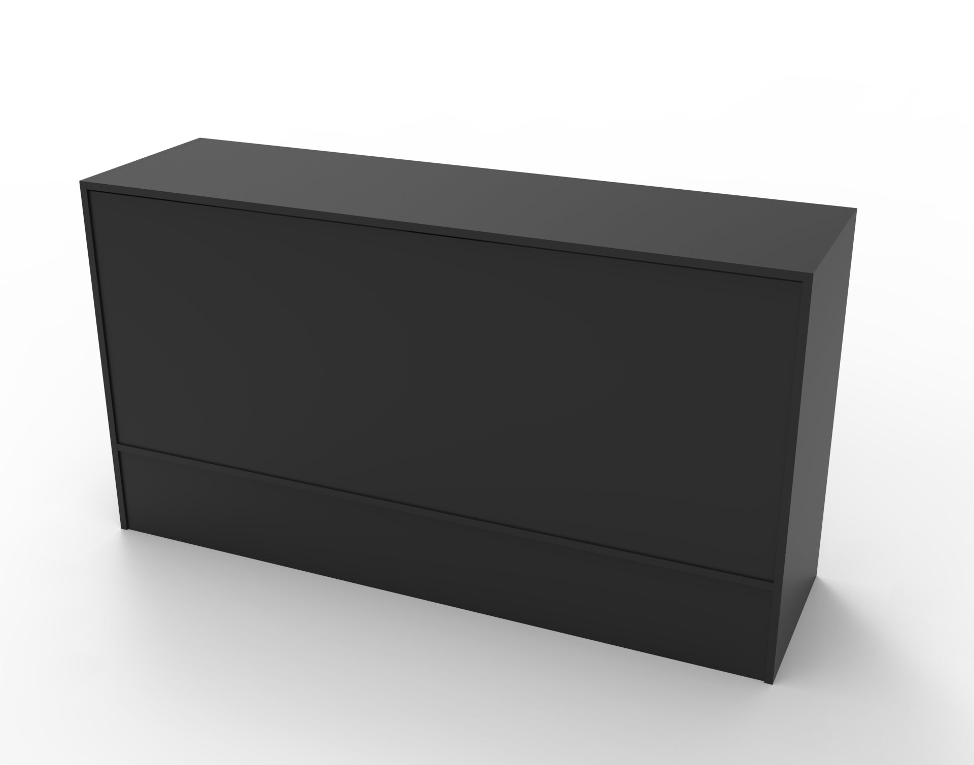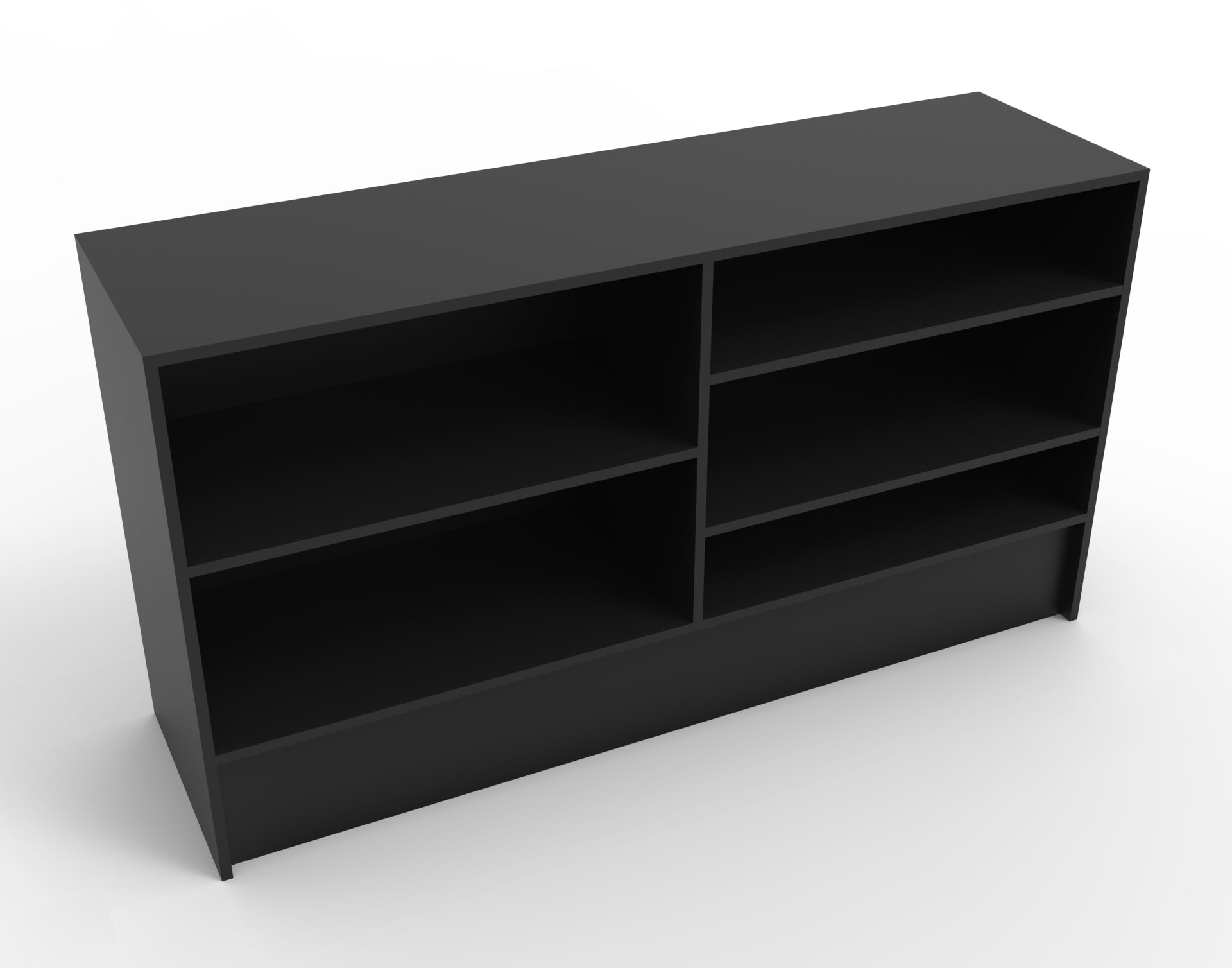 Black finish checkout counter of 6'L X 38"H X 20"D has durable melamine laminate surface.