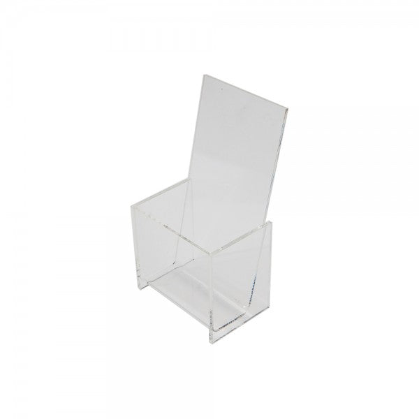 A clear acrylic brochure counter top holder slightly angled to better literature display. Use below eye level for best readability. It takes up only a small amount of space and is see-through.