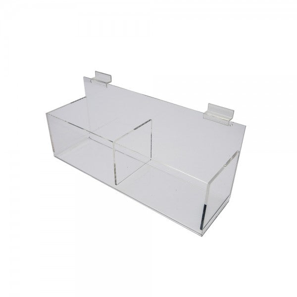 An acrylic slatwall double bin display, 16" x 5" x 5".